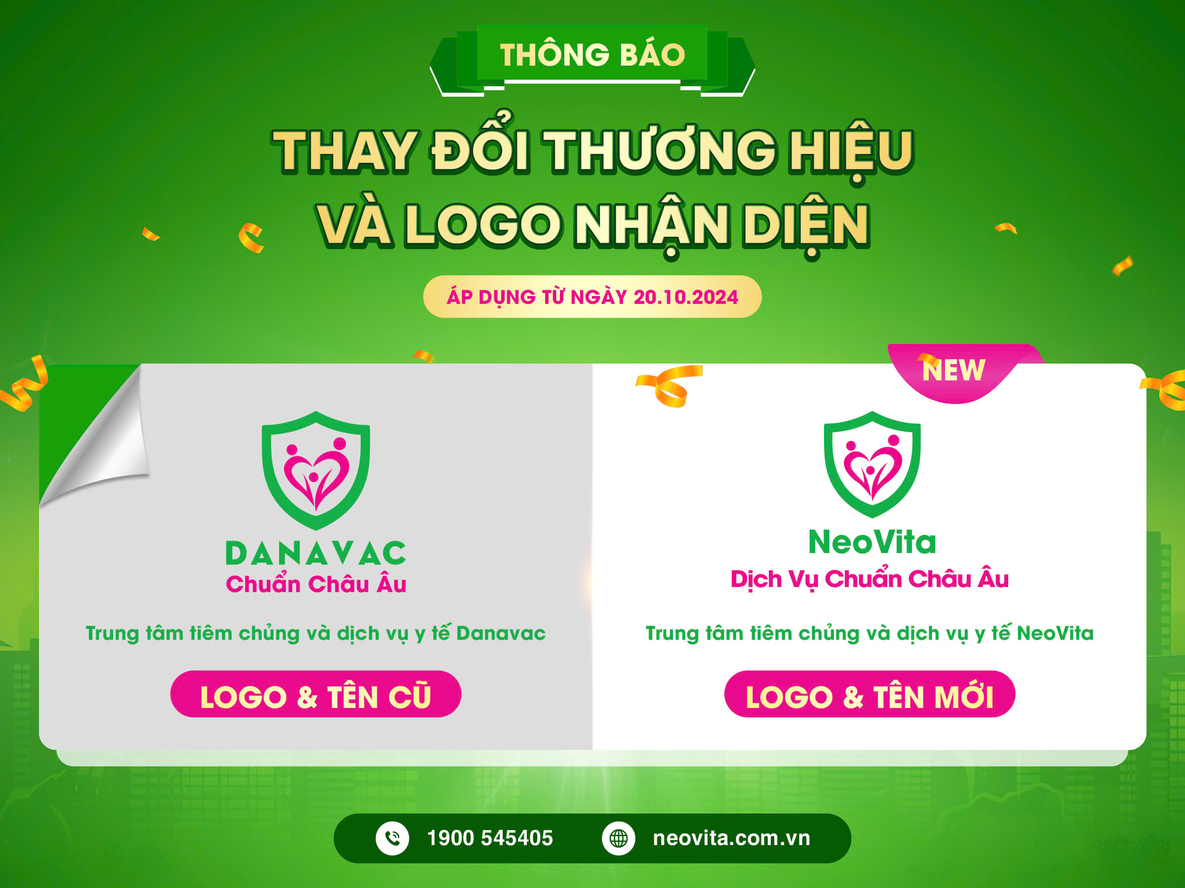 Với tầm nhìn chiến lược mới và sứ mệnh mang lại giá trị vượt trội, từ ngày 20/10/2024, Danavac sẽ chính thức chuyển đổi thành thương hiệu NeoVita và mở rộng hoạt động ra toàn quốc với cam kết mạnh mẽ mang lại những trải nghiệm dịch vụ tiêm chủng và dịch vụ y tế tiên tiến hơn, an toàn hơn và tiện ích hơn “Dịch vụ chuẩn Châu Âu”.