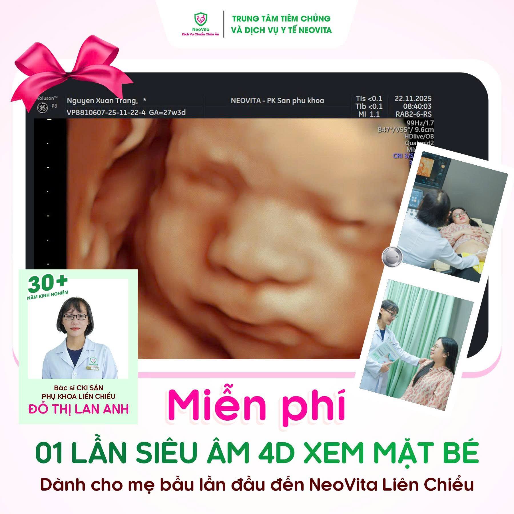🎁 Đặc biệt: Dành cho mẹ bầu lần đầu đến khám tại NeoVita Liên Chiểu, mẹ còn được tặng thêm 01 lần siêu âm 4D miễn phí – để thấy con rõ nét từng đường nét gương mặt, ghi lại khoảnh khắc đầy xúc động và kết nối yêu thương từ sớm.
